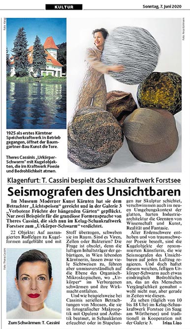 Im Museum Moderner Kunst Kärnten hat sie dem Betrachter "Lichtspeisen" gereicht und in der Galerie3 "Verbotene Früchte der hängenden Gärten" gepflückt. Nur zwei Beispiele für die grandiose Formensprache von Theres Cassini, die sich nun im Kelag-Schaukraftwerk Forstsee zum "Urkörper-Schwarm" verdichtet.