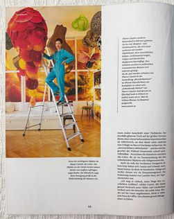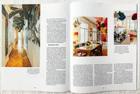 Im Wohnzimmer steht ein ehemaliger Leuchttisch, unter dessen Glasplatte zahlreiche Mineralien arrangiert wurden. Zu sehen sind sie durch einen ovalen Ausschnitt einer Tischdecke. Der ebenfalls gläserne Tisch auf der großen Terrasse diente einst einem befreundeten Kunsthistoriker als Arbeitstisch, an dem dieser unter anderem eine Trilogie zu Marcel Duchamp verfasst hat. Als "unverzichtbares Möbelstück" – und das wird angesichts der Plafond-Ornamentik schnell nachvollziehbar – bezeichnet die Künstlerin eine hohe Alu-Leiter, die sie im Zusammenhang mit den schwebenden Objekten sehr liebgewonnen hat.