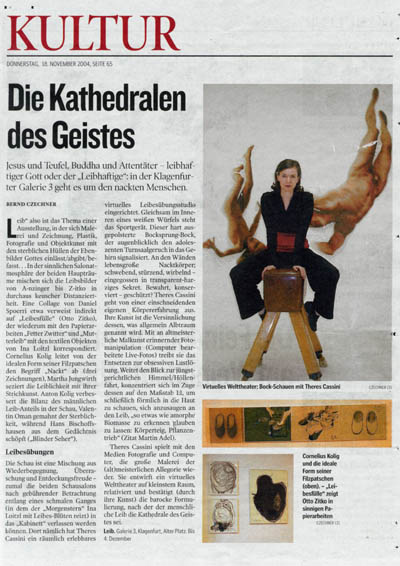 Theres Cassini spielt mit den Medien Fotografie und Computer, die große Malerei der (alt)meisterlichen Allegorie wieder. Sie entwirft ein virtuelles Welttheater auf kleinstem Raum, relativiert und bestätigt (durch ihre Kunst) die barocke Formulierung, nach der der menschliche Leib die Kathedarle des Geistes sei.