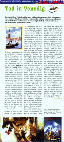 Die Nähe zu Thomas Manns Novelle "Der Tod in Venedig" ist thematischer wie artifizieller Natur. Das Phänomen der Krankheit als Ausdrucksmittel innerer Größe oder anders herum, die Größe als Krankheit, hat Thomas Mann zeitlebens beschäftigt. Auch die todgeweihte Katze Johnny erlebt auf ihrer magischen Reise Anzeichen der Lebenssteigerung wie Momente der tiefsten Verzweiflung. Und selbst die treue Begleiterin kann sich dem Reiz manch lustvoller Begegnung nicht entziehen. Durchlebt der Schriftsteller Aschenbach bei Thomas Mann die "Raserei des Untergangs" ebenso in einem Traum entsetzt, zugleich aber fasziniert, in einer Verbindung aus Angst und Lust, so nimmt dieses Motiv hier gleichfalls die zentrale Rolle ein. Und obwohl die beiden Katzen den (Über-)Lebenskampf gemeinsam in Angriff nehmen, bleibt die Einsamkeit des Todgeweihten stets spürbar. Diese Vielschichtigkeit des Textes und seine sprachliche Virtuosität - die Lyrik und Prosa zu einem einzigen Fluss vereint - stellen eine herausragende Leistung innerhalb der Gattung Bilderbuch dar. Sie zeigen auf, dass die Grenzen zwischen Kinder- und Erwachsenenliteratur durchaus aufgehoben werden können. Kategorien, wie die des Geschmacks sollte man bei derart artifiziellen Werken ohnehin ausschließen. Und Kinder, das ist immer wieder zu beobachten, lieben das Wechselspiel aus Realität und Fiktion. Wenn sie zudem ein Faible für Kunst haben, genießen sie in diesem Buch die Feinsinnigkeit der Sprache sowie ihre Melodik. Selbst kleineren ZuhörerInnen entgeht es nicht, dass die rhythmische, versähnliche (auch in der Typographie umgesetzt) Erzählweise, die zudem immer wieder durch Gedichte garniert ist, zwei Bewusstseinsebenen vorstellt. Durch die Variationsmöglichkeiten des Vorlesenden ergeben sich hierdurch reizvolle theatralische Gestaltungsmittel, die aus dem Text ins Rollenspiel führen.