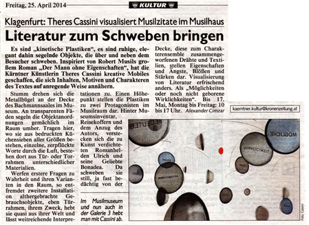 Es sind "kinetische Plastiken", es sind ruhige, elegant dahin segelnde Objekte, die über und neben dem Besucher schweben. Inspiriert von Robert Musils großem Roman "Der Mann ohne Eigenschaften", hat die Kärntner Künstlerin Theres Cassini kreative Mobiles geschaffen, die sich Inhalten, Motiven und Charakteren des Textes auf anregende Weise annähern.