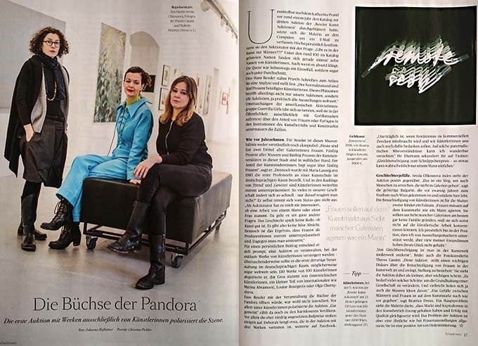 Die Büchse der Pandora Wie vor Jahrzehnten. Für Ressler ist dieses Missverhältnis weder verständlich noch akzeptabel: „Heute sind fast zwei Drittel aller Galeristinnen Frauen. Fünfzig Prozent aller Museen und fünfzig Prozent der Kunstuniversitäten in dieser Stadt sind in weiblicher Hand. Der Anteil der Kunststudentinnen liegt sogar über fünfzig Prozent“, sagt er. „Dennoch wurde mit Maria Lassnig erst 1980 die erste Professorin an einer Kunstschule im deutschsprachigen Raum bestellt. Und in den Rankings von ,Trend‘ und ,Gewinn‘ sind Künstlerinnen weiterhin extrem unterrepräsentiert. So vieles in unserer Gesellschaft ändert sich so schnell – nur darauf reagiert man nicht?“ Er selbst nimmt sich vom Status quo nicht aus: „Als Auktionator hat es mich nie interessiert, ob eine Arbeit von einem Mann oder einer Frau stammt. Da geht es um ganz andere Fragen. Das Geschlecht spielt keine Rolle, ob Kunst gut ist. Es gibt also keine böse Absicht. Dennoch ist das Ergebnis, dass Frauen als Produzentinnen extrem unterrepräsentiert sind. Dagegen muss man ansteuern.“ Für einen persönlichen Beitrag entschied er sich prompt, eine Auktion zu veranstalten, bei der exklusiv Werke von Künstlerinnen versteigert werden – überraschenderweise sollte es die erste derartige Veranstaltung im deutschsprachigen Raum, möglicherweise sogar weltweit sein. 130 Werke von 100 Künstlerinnen akquirierte er, das Gros stammt von österreichischen Künstlerinnen, ein kleiner Teil von internationalen wie Marina Abramović, Louise Bourgeois oder Olga Chernysheva. Dass Ressler mit der Veranstaltung die Büchse der Pandora öffnen würde, war wohl nicht intendiert. Vor allem unter Künstlerinnen polarisierte die Auktion. „Gut gemeint“ zählt da noch zu den harmloseren Verdikten. Vor allem die eher niedrig angesetzten Rufpreise stoßen einigen auf. Deborah Sengl etwa, die in der Auktion mit drei Werken vertreten ist, wetterte auf Facebook: „Unerträglich ist, wenn Feminismus zu kommerziellen Zwecken missbraucht wird und wir Künstlerinnen uns auch noch dafür bedanken sollen. Auf solche paternalistischen Missverständnisse kann ich wunderbar verzichten.“ Ihr Ehemann sekundiert ihr auf Twitter: „Gleichberechtigung zum Schnäppchenpreis – so etwas kann wahrscheinlich nur einem Mann einfallen.“ Geschlechtergefälle. Sevda Chkoutova indes steht der Auktion positiv gegenüber. „Das ist ein Weg, um auch Menschen zu erreichen, die nicht in Galerien gehen“, sagt die gebürtige Bulgarin, die vor zwanzig Jahren zum Studium nach Wien gekommen ist und seitdem hier lebt. Die Benachteiligung von Künstlerinnen ist für die Mutter zweier Kinder ein Faktum. „Frauen müssen auf dem Kunstmarkt wie ein Mann agieren. Sie sollten aus Sicht mancher Galeristen am besten gar keine Familie gründen, weil sie sich sonst nicht auf die künstlerische Arbeit konzentrieren könnten. Ich persönlich bin in der Position, dass ich von Ausstellungsmachern unterstützt werde, aber viele meiner Freundinnen haben dieses Glück nicht gehabt.“ „Von Gleichberechtigung ist man in der Kunstwelt meilenweit entfernt“, findet auch die Fotokünstlerin Theres Cassini. „Diese Auktion stößt einen wichtigen Diskurs über die Benachteiligung von Frauen in der Kunstwelt an und zwingt, Stellung zu beziehen.“ Sie sieht die Auktion daher als kleinen, aber wichtigen Schritt: „Es bedarf vieler solcher Schritte, um die Grundhaltung einer Gesellschaft zu verändern. Und vielleicht holen sich ja auch die Museen Ideen davon.“ „Das Gefälle zwischen Männern und Frauen ist auf dem Kunstmarkt nach wie vor gegeben“, sagt Béatrice Dreux. Das Hauptproblem sieht die Malerin darin, „dass Markt und Kapitalismus in den Kunstbetrieb Einzug gehalten haben und Erfolg mit Qualität gleichgesetzt wird. Das Problem der Auktion ist aber eine ähnliche wie bei Frauenausstellungen allgemein: Sie ist eine positive Art von Diskriminierung.