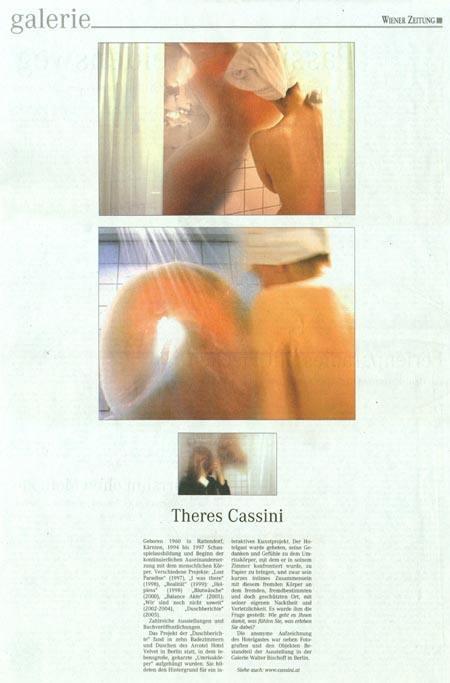 Das Projekt der "Duschberichte" fand in 10 Badezimmern und Duschen des Arcotel Hotel Velvet in Berlin statt, in dem lebensgroße, geharzte "Umrisskörper" aufgehängt wurden. Sie bildeten den Hintergrund für ein interaktives Kunstprojekt. Der Hotelgast wurde gebeten, seine Gedanken und Gefühle zu dem Umrisskörper, mit dem er in seinem Zimmer konfrontiert wurde, zu Papier zu bringen, und zwar sein kurzes intimes Zusammensein mit diesem fremden Körper an dem fremden, fremdbestimmten und doch geschützten Ort, mit seiner eigenen Nacktheit und Verletzlichkeit, Es wurde ihm die Frage gestellt: Wie geht es Ihnen damit, was fühlen Sie, was erleben Sie dabei?