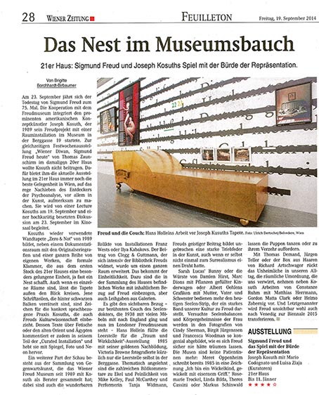Wiener Zeitung 18.09.2014 Am 23. September jährt sich der Todestag von Sigmund Freud zum 75. Mal. Die Kooperation mit dem Freudmuseum integriert den prominenten amerikanischen Konzeptkünstler Joseph Kosuth, der 1989 sein Freudprojekt mit einer Rauminstallation im Museum in der Berggasse 19 startete. Zur gleichzeitigen Festwochenausstellung "Wiener Diwan, Sigmund Freud heute" von Thomas Zaunschirm im damaligen 20er Haus wollte Kosuth nicht beitragen. Dafür bietet ihm die aktuelle Ausstellung im 21er Haus immer noch die beste Gelegenheit in Wien, auf das rege Nachleben des Entdeckers der Psychoanalyse, vor allem in der Kunst, aufmerksam zu machen. Sie wird von einer Lecture Kosuths am 19. September und einer hochkarätig besetzten Diskussion am 23. September im Kinosaal begleitet. Kosuths wieder verwendete Wandtapete "Zero & Not" von 1989 bildet, neben einem Dokumentationsraum mit den Originalseriegrafien und einer ganzen Reihe von eigenen Werken, die formale Klammer, die aus dem ersten Stock des 21er Hauses eine besonders gelungene Einheit, ja fast ein Nest schafft. Auch wenn es einzelne Räume sind, lässt die Tapete außen den Blick kreisen. Jene Schriftzeilen, die hinter schwarzen Balken verrätselt sind, sind Zeichen für die konkret sprachbezogene Praxis Kosuths, die auch Freuds Kulturwissenschaft einbezieht. Dessen Texte über Fetische oder den alten Orient und Ägypten kommentiert er zudem in seinem Teil der "Curated Installation" und hebt sie mit Spiegel, Foto und Neon hervor. Kosuths wieder verwendete Wandtapete "Zero & Not" von 1989 bildet, neben einem Dokumentationsraum mit den Originalseriegrafien und einer ganzen Reihe von eigenen Werken, die formale Klammer, die aus dem ersten Stock des 21er Hauses eine besonders gelungene Einheit, ja fast ein Nest schafft. Auch wenn es einzelne Räume sind, lässt die Tapete außen den Blick kreisen. Jene Schriftzeilen, die hinter schwarzen Balken verrätselt sind, sind Zeichen für die konkret sprachbezogene Praxis Kosuths, die auch Freuds Kulturwissenschaft einbezieht. Dessen Texte über Fetische oder den alten Orient und Ägypten kommentiert er zudem in seinem Teil der "Curated Installation" und hebt sie mit Spiegel, Foto und Neon hervor. Ein weiterer Part der Schau besteht aus der Sammlung von Gegenwartskunst, die das Wiener Freud Museum seit 1989 mit Kosuth als Berater gesammelt hat; dabei sind auch die wunderbaren Relikte von Installationen Franz Wests oder Ilya Kabakovs. Der Beitrag von Clegg & Guttmann, der sich intensiv der Bibliothek Freuds widmet, wurde um einen ganzen Raum erweitert. Das bekommt der Einheitlichkeit. Dazu sind die in der Sammlung des Hauses befindlichen Werke mit inhaltlichem Bezug auf Freud einbezogen, aber auch Leihgaben aus Galerien. Es gibt den sichtbaren Bezug - zur berühmten Couch des Seelendoktors, die 1938 mit vielen Möbeln mit nach England ging und nun im Londoner Freudmuseum steht - Hans Hollein füllte die Leerstelle für die "Traum und Wirklichkeit"-Ausstellung 1985 mit seiner goldenen Nachbildung, Victoria Browne fotografierte kürzlich nur die Leerstelle selbst in der Berggasse. Thematisch angelehnt sind die zahlreichen Bildkommentare zu Ekel und Peinlichkeit von Mike Kelley, Paul McCarthey und Performerin Tanja Widmann, Freuds geistiger Beitrag bildet ungebrochen eine starke Triebfeder in der Kunst, auch wenn er selbst nicht einmal zum Surrealismus einen Draht hatte. Sarah Lucas‘ Bunny oder die Würste von Damien Hirst, Marc Dions mit Pflanzen gefüllter Kinderwagen oder Albert Oehlens Grafiken mit Mutter, Vater und Schwester bedienen mehr den heutigen Seelen-Strip, der ein starkes Band unserer Kultur zu Freud darstellt. Versuchte Seelenbalancen und Körpergeheimnisse der Frau werden in den Fotografien von Cindy Sherman, Birgit Jürgenssen und Francesca Woodman so kongenial abgebildet, wie es sich Freud sicher nie hätte träumen lassen. Die Musen sind keine Patientinnen mehr: Meret Oppenheim schreibt bereits 1985 in eine Zeichnung "Ich bin ein Wickelkind, gewickelt mit eisernem Griff." Rosemarie Trockel, Linda Bilda, Theres Cassini oder Markus Schinwald lassen die Puppen tanzen oder zu ihrem Verzehr auffordern. Mit Thomas Demand, Jürgen Teller oder der Box aus Haaren von Richard Artschwager rückt das Unheimliche in unseren Alltag, die räumliche Umordnung, die uns verwirrt, nehmen neben Kosuth Arbeiten von Constanze Ruhm mit Matthias Herrmann, Gordon Matta Clark oder Heimo Zobernig vor. Und Letztgenannter wird Freud unsichtbar wohl auch nach Venedig zur Biennale 2015 transferieren.
