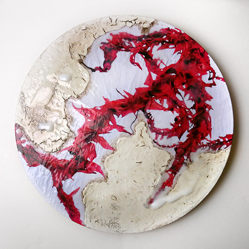 MOOS Moos-Tondi 04 2016, Moosfotografie auf Textil verleimt, Acrylfarbe, Holzleim, Erde, Radfelge, D 63 cm