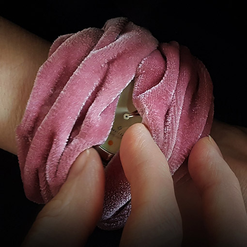 Durch Zweifingerspreizung öffnet sich der weiche fleischfarbene Samtvorhang und gibt den Blick auf das Ziffernblatt frei: die angenehme Suche bringt eine Spaltung von haptischer und optischer Erfahrung mit sich. Der verdoppelte Auftritt der Sinne ist befremdend und komisch. Die Uhr entblößt die Zeit nicht selbst, die Falten bilden erst durch Teilung die Form einer Vulva oder eines Mundes, umgeben von faltiger Haut, vergleichbar dem alten Kultbild der Gorgo-Medusa in archaisch-etruskischer Kunst. Die Ähnlichkeit mit der personifizierten Vulva, die als mythisches Wesen von den Griechen im Umfeld der Orphiker und der Eleusinischen Mysterienkulte „Baubo“, sowie nach den Homerischen Hymnen „Iambe“ genannt wurde, lässt eine Menge Assoziationen zu, die der Fruchtbarkeit und Sexualität auch das Gegenbild dämonischer Abschreckung anschließen(1). Dieses Bild der alten Gorgo mit Falten, die sich aus Wangen und Kinn um den Mund bilden, oszilliert zwischen Lachen und Drohen, vor allem die herausragende Zunge und Zähne verstärkt die Abwehrgeste, damals apotropäisch eingesetzt gegen Angreifer von Tempeln. Was zuerst der Akroter wird im Mittelalter zur grotesken Kathedralplastik, der Drolerie.