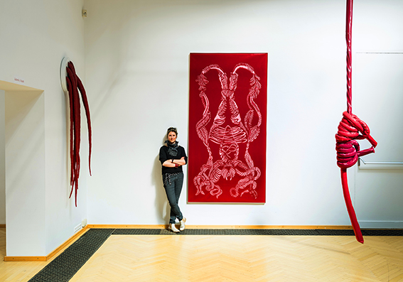 Ina Loitzl vor ihren Arbeiten: Rothaarig, Gießaufblüte IV, Weiblicher Knoten Foto © Arnold Pöschl