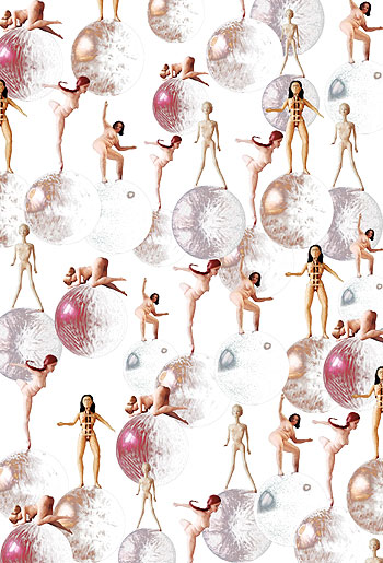 Skulpturen und Fotoarbeiten balance als konzeptionelle Weiterführung der Arbeit realität von 1999. Abermals aus dem Ausgangsmaterial "Barbie" modellierte Frauenakte als Stellvertreter unserer Gesellschaft: Die Übergewichtige, die Magersüchtige, die Betende, die Überrollte, die beinamputierte Balletttänzerin und die Hommage an Frida Kahlo´s "Gebrochene Säule" mit autobiographischem Bezug. Der Bruch zwischen idealisierter Barbie - deren nach außen projiziertem Bild - und der Realität, durch "Barbie-reste" in der Skulptur sichtbar gemacht. Die Frauen(körper) im Überlebenskampf auf einer instabilen Bowlingkugel balancierend. Der immer gleiche Hintergrund ("Idealhimmel" von Margritte) als absurde Illusion gesellschaftlicher Idealbedingungen. Die "Bewegungsunschärfe" - als fotografisches Mittel eingesetzt - von dynamischer Unschärfe der Objekte bis zu deren Auflösung. |