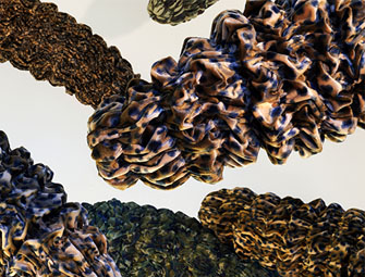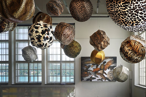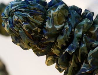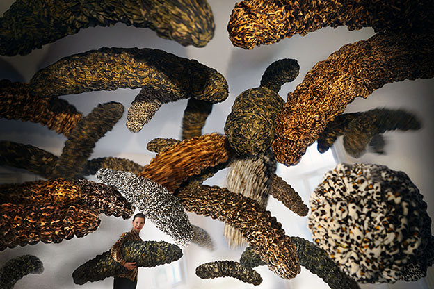 GURKENSCHWARM, 2019, Draht, Textilien, 28 Objekte, je ca. 130 x 35 cm, Installationsgröße variabel |