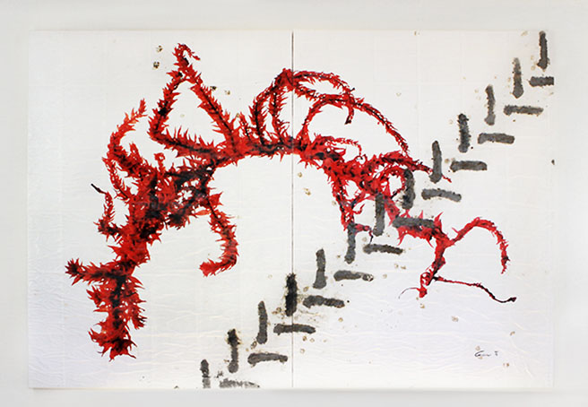 MOOS Rhytidiadelphus Moosbild, 2016, Moosfotografie auf Textil gecrasht verleimt, Erde, Holzleim, Keilrahmen doppelteilig 240 x 344 x 7cm