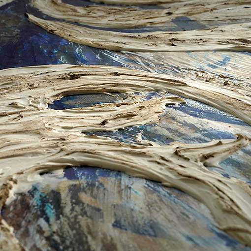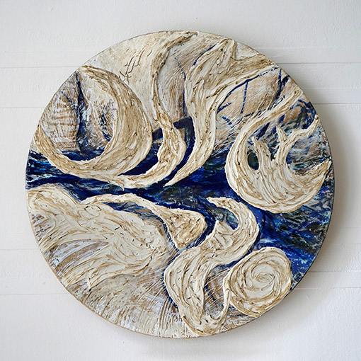 MOOS Moos-Tondi 03 2016, Moosfotografie auf Textil verleimt, Acrylfarbe, Holzleim, Erde, Radfelge, D 57 cm